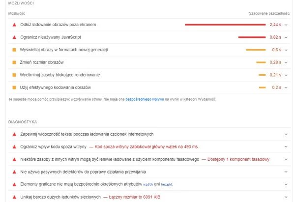 Wskazówki dotyczące optymalizacji wygenerowane przez Google PageSpeed Insights.