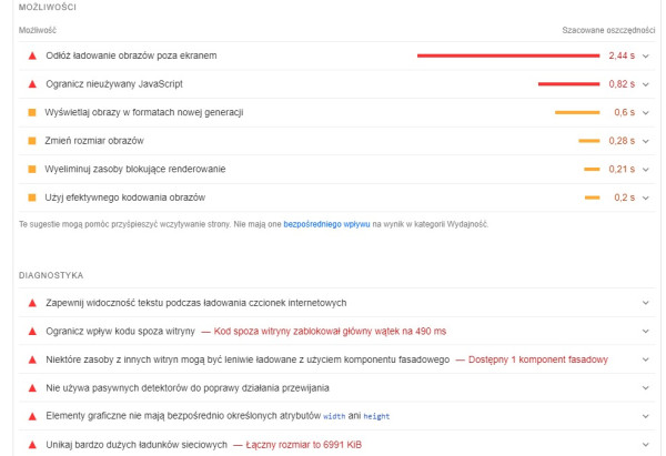 Wskazówki dotyczące optymalizacji wygenerowane przez Google PageSpeed Insights.
