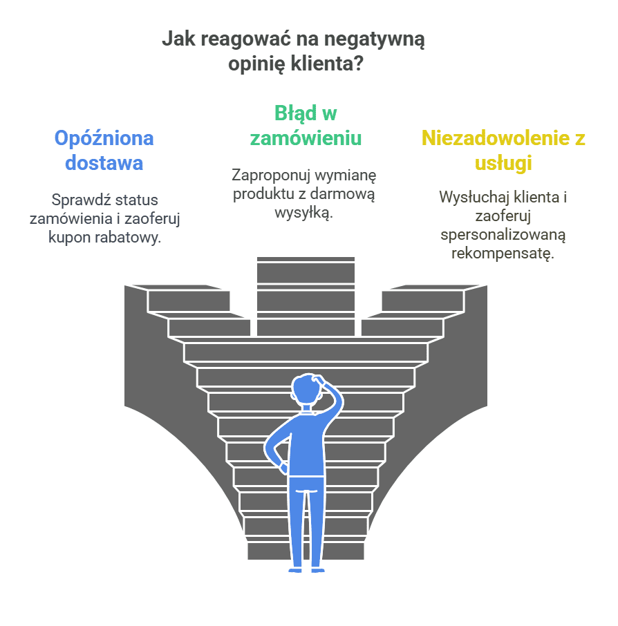 Negatywne opinie często wynikają z tego, że klient czuje się pominięty lub niesłyszany. Samo „Przepraszamy za niedogodności” nie wystarczy – liczy się konkretne działanie. Jeśli problem dotyczy produktu, zaproponuj jego wymianę lub zwrot. Jeśli usługa nie spełniła oczekiwań, zaoferuj rabat na kolejne zakupy.