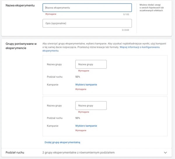 - Wypełnij niezbędne informacje, takie jak nazwa eksperymentu, daty rozpoczęcia i zakończenia, grupy porównywane w eksperymencie itp.