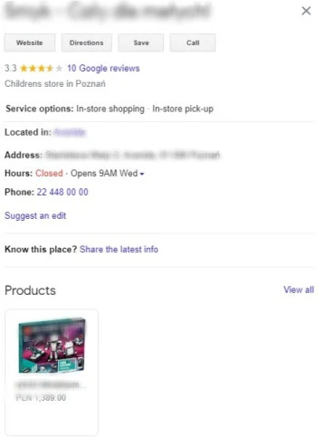 Sekcja produktów i usług pozwala dokładniej zaprezentować ofertę Twojej firmy. Możesz opisać poszczególne usługi, dodać ceny, zdjęcia i linki prowadzące na stronę internetową. Dzięki temu użytkownicy szybciej znajdą to, czego szukają, a Google otrzyma więcej danych do dopasowania profilu do konkretnych zapytań.