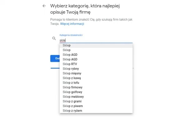 Wybierz najlepiej opisującą nas branżę. Niestety możliwe jest dodanie tylko branży z listy rozwijanej, więc być może musisz pójść na kompromis, gdy brakuje Twojej branży w Google Moja Firma i znaleźć coś pokrewnego.