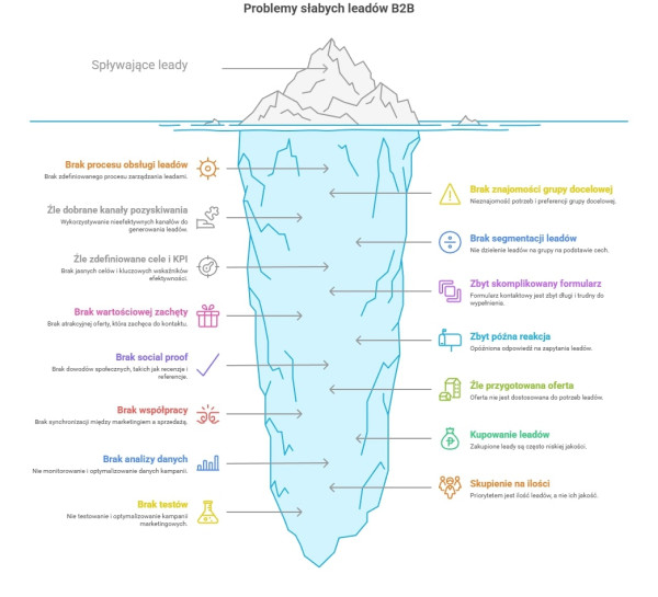 Najczęstsze błędy w pozyskiwaniu leadów B2B wynikają nie z braku narzędzi, ale z braku procesu, niewłaściwych założeń i zbyt ogólnej komunikacji. Eliminacja tych błędów często daje szybszy efekt niż uruchamianie nowych działań marketingowych.