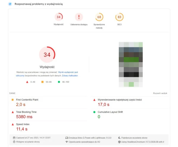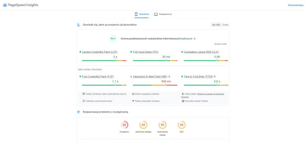 - Sprawdź wyniki - po zakończeniu analizy zobaczysz ocenę dla wersji mobilnej i stacjonarnej strony, wyrażoną w skali od 0 do 100. Ponadto otrzymasz listę sugestii dotyczących poprawy wydajności strony.
