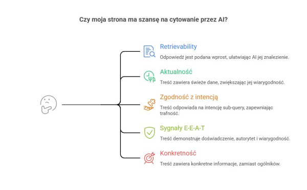 AI najczęściej cytuje te strony, które dają krótką, jednoznaczną odpowiedź na konkretne sub-query. Liczy się nie tylko dopasowanie słów kluczowych, ale przede wszystkim jakość odpowiedzi: jasność, kompletność, brak zbędnych wstępów, obecność danych, definicji i elementów łatwych do zacytowania. Systemy AI nie wybierają źródeł przypadkowo. Po wykonaniu sub-queries porównują dokumenty pod kątem tego, czy da się z nich szybko i bezpiecznie „wyciąć” fragment odpowiedzi, który pasuje do konkretnego pytania pomocniczego. Najczęściej decydują: