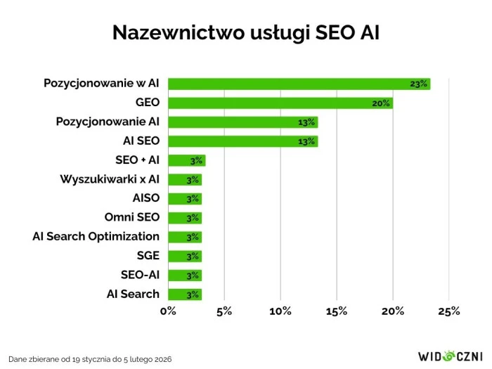 Pozycjonowanie w modelam LLM to stosunkowo nowy obszar, dlatego agencje różnie nazywają tę usługę w swojej ofercie. W tej części przyjrzeliśmy się, jak firmy komunikują działania związane z SEO AI i jakie określenia stosują, aby opisać SEO dostosowane do wyszukiwarek generatywnych.