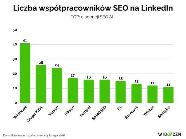 Liczbę współpracowników oraz role w zespole weryfikowaliśmy na podstawie oficjalnych profili LinkedIn. Sprawdzając liczbę specjalistów SEO, uwzględnialiśmy wyłącznie osoby faktycznie realizujące działania SEO. Wykluczaliśmy role sprzedażowe, Ads, analitykę i stanowiska, które nie są jednoznacznie związane z SEO.