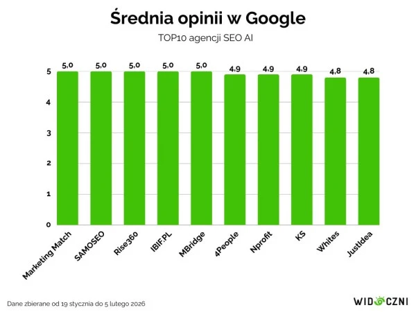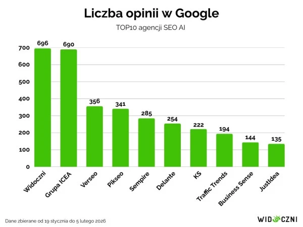 Opinie w Google to jeden z istotnych wskaźników reputacji agencji SEO AI. Pokazują poziom satysfakcji klientów oraz sposób prowadzenia współpracy, w tym transparentność i jakość komunikacji. Dlatego w tej kategorii przeanalizowaliśmy zarówno liczbę opinii, jak i średnią ocen.