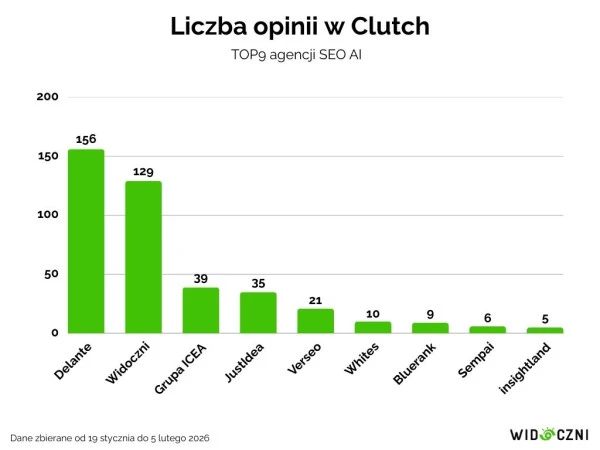 Liczba opinii i średnia ocen w Clutch - TOP10 agencji SEO AI