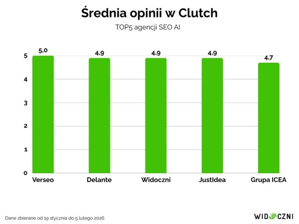 Wysokie oceny na Clutch świadczą nie tylko o skuteczności działań SEO AI, ale także o jakości obsługi, transparentności procesów i zaangażowaniu zespołu. W zestawieniu TOP10 uwzględniliśmy tylko firmy z minimum 20 opiniami, co zapewnia uczciwe porównanie agencji o różnej skali działalności.