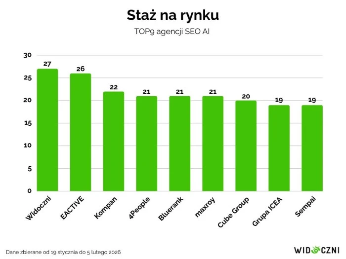 Staż na rynku to jeden z istotnych wskaźników doświadczenia oraz stabilności agencji SEO AI. W tej kategorii przeanalizowaliśmy daty założenia firm, bazując głównie na informacjach dostępnych na profilach LinkedIn.