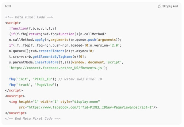 Jak wypromować sklep na FB? Najpierw musisz dodać kod śledzenia Facebooka w witrynie e-commerce. Jeśli korzystasz z popularnych platform e-commerce, np. Shopify czy Shoper, nie musisz dokonywać zmian w kodzie. Wystarczy, że skopiujesz 16-cyfrowy kod z narzędzia Menedżer Reklam i wkleisz go w odpowiednim miejscu w panelu zarządzania na platformie e-commerce. Jeśli prowadzisz sklep na autorskim systemie, skontaktuj się z programistą / web developerem.