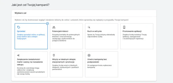 - Wybierz cel marketingowy spośród „Sprzedaż”, „Potencjalni klienci”, „Ruch w witrynie”, “Promowanie aplikacji”, “Zwiększanie świadomości marki i szansy na rozważenie zakupu”, “Wizyty w lokalnym sklepie i promocje” lub “Utwórz kampanię bez podpowiedzi”.