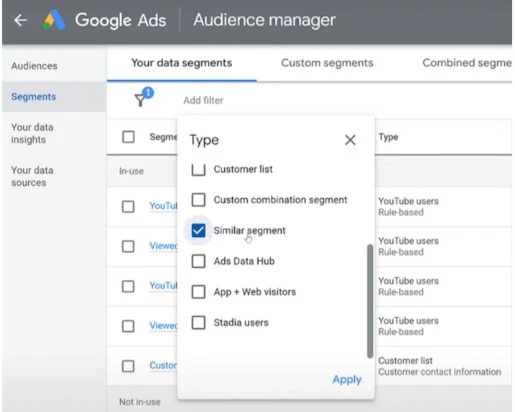Wybór lookalike audience w Google Ads, źródło: wordstream.com/blog/ws/2022/12/13/google-sunsetting-similar-audiences.