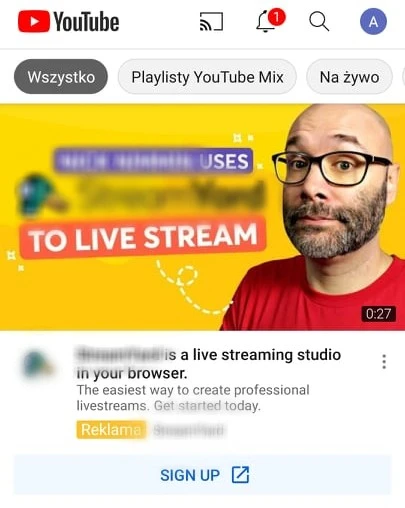 Przykład reklamy Google Discovery wyświetlanej na stronie głównej Youtube.