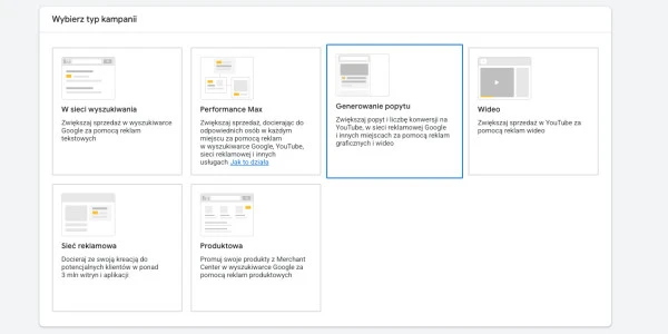 - Wybierz typ kampanii Demand Gen (Generowanie Popytu).