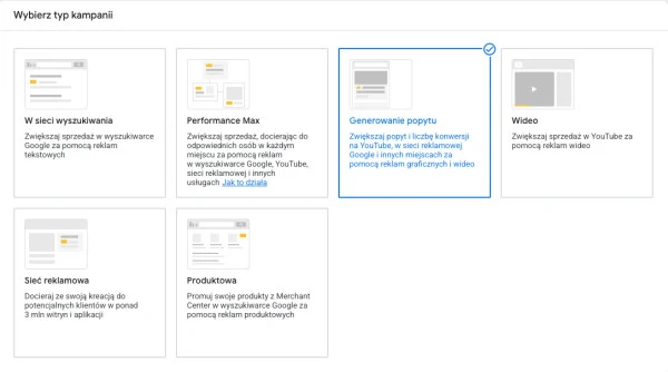 Wybór kampanii Demand Gen w panelu Google Ads.