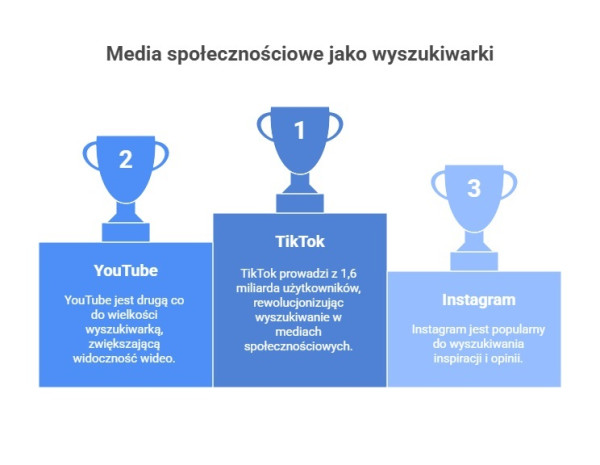 Wzrost znaczenia mediów społecznościowych widać doskonale na przykładzie TikToka, który w ostatnich latach znacząco zwiększył liczbę użytkowników. Jeszcze w 2021 r. było to ok. miliarda użytkowników, natomiast obecnie (dane na pierwszy kwartał 2025 r.) jest to ok. 1,6 mld. Kolejnym przykładem jest YouTube, będący obecnie drugą co do wielkości wyszukiwarką na świecie. Dobrze zoptymalizowane wideo zwiększa widoczność zarówno w samej platformie, jak i w wynikach Google.