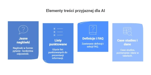 Pisz tak, jakby ChatGPT czy inna wyszukiwarka AI miała to zacytować w całości. Najlepiej sprawdzają się krótkie, konkretne odpowiedzi na pytania użytkowników, takie, które można zacytować jako gotową wskazówkę. Treść przyjazna dla AI to treść zawierająca: