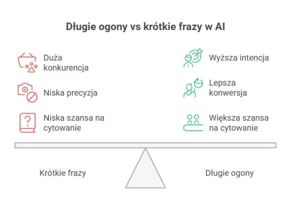 Tak, ich znaczenie rośnie. Pozycjonowanie na długi ogon, oparte na frazach bliższych językowi użytkownika, jest szczególnie skuteczne w środowisku AI search. Zamiast ogólnego SEO AI użytkownik częściej wpisuje pytania w stylu: czy AI zastąpi Google w przyszłości lub jak przygotować stronę pod wyszukiwarki oparte na AI. Takie zapytania stają się standardem, a modele AI szukają odpowiedzi w treściach, które je bezpośrednio odzwierciedlają. Tworząc artykuł, warto więc zadbać o to, by obok samych informacji pojawiały się też pełne sformułowania zbliżone do tego, co użytkownicy realnie wpisują w wyszukiwarkę.