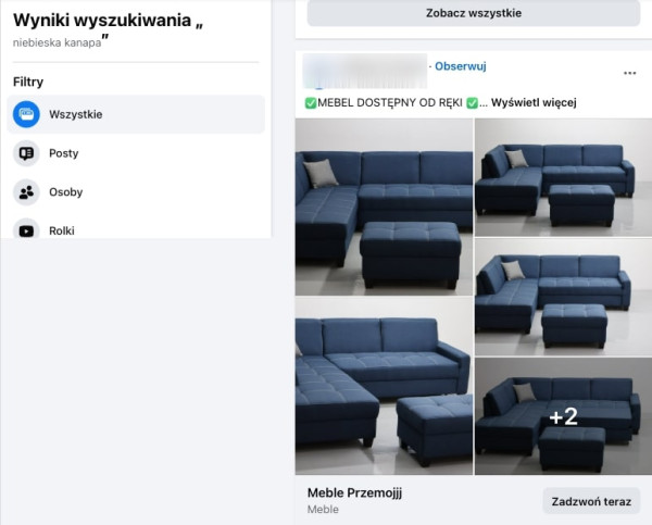 Wyniki dla słowa kluczowego na Facebooku.