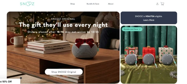 Snooz to sklep jednoproduktowy z głośnikiem emitującym tzw. white noise, czyli uspokajający szum i inne kojące odgłosy. Takie dźwięki pomagają zasypiać i relaksują, są doskonałe dla każdego, kto ma problem z zasypianiem czy epizodami lękowymi. Snooz jest dostępny w wersji Original, Pro i Go - przenośnej odsłonie klasycznego głośnika.