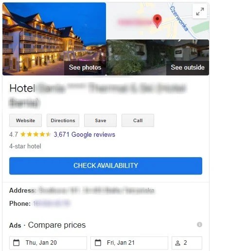 Przykład wykorzystania CTA w wizytówce Google.