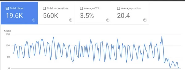 Spadek liczby kliknięć w narzędziu Google Search Console, źródło: conductor.com/academy/ranking-drop/#came-up-empty-look-into-this.