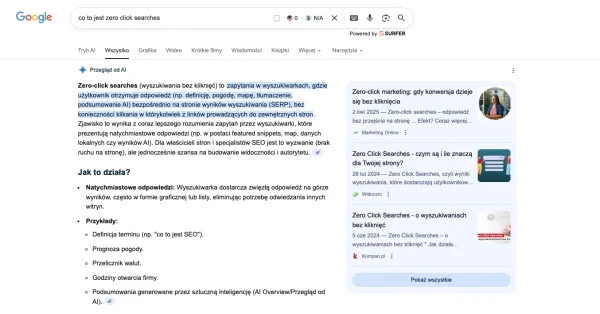 Ogromna część zapytań użytkowników kończy się obecnie na zero-click searches i należy to uwzględnić w analizie widoczności. Zero-click search to sytuacja, w której wyszukiwanie kończy się na wyświetleniu wyników AI takich jak Google AI Overviews, będących podsumowaniem AI z różnych stron na dany temat. Użytkownik nie klika wtedy w link i nie przechodzi na stronę źródłową, zatrzymuje się na przeczytaniu podsumowania.