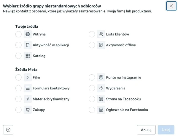 - Skorzystaj z opcji retargetingu na niestandardowe grupy odbiorców (Custom Audience) - dzięki niej będziesz mógł kierować reklamy na odbiorców z list klientów, odbiorców, którzy odwiedzili wcześniej stronę sklepu lub weszły w interakcję z katalogiem produktów.