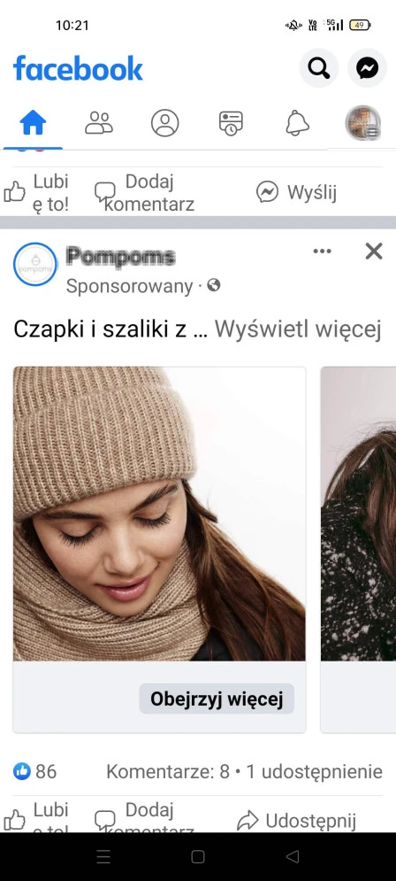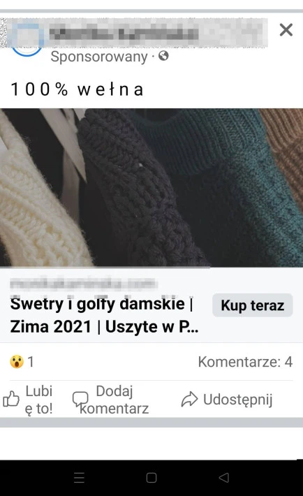 Przykład reklamy z pojedynczym zdjęciem na Facebooku na smartfonie.