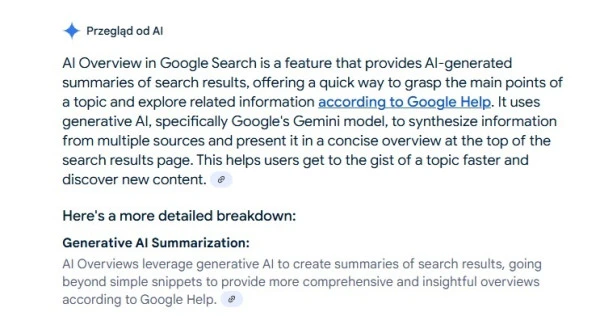Sztuczna inteligencja wpływa nie tylko na sposób wyszukiwania, ale także na sposób prezentowania wyników. Coraz większą rolę odgrywają odpowiedzi bezpośrednie m.in. Google Overwiev, fragmenty rozszerzone oraz podsumowania informacji wyświetlane bez konieczności przechodzenia na stronę. Według danych SparkToro i SimilarWeb ponad 58 procent wyszukiwań w Google kończy się bez kliknięcia w jakikolwiek wynik. Użytkownik otrzymuje odpowiedź bezpośrednio w wynikach wyszukiwania.