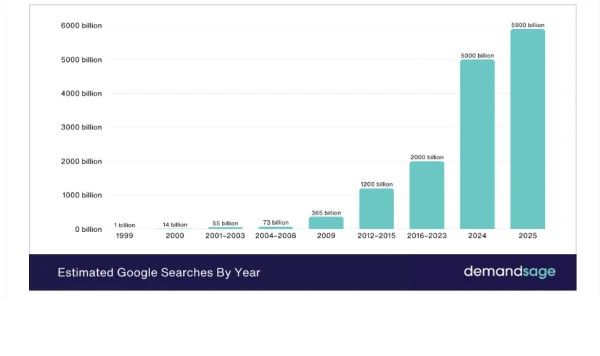 Szacowana liczba wyszukiwań w Google w latach 1999-2025