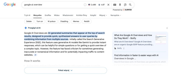 Google AI Overviews działa jak warstwa podsumowująca złożone informacje, którą widzisz bezpośrednio nad wynikami wyszukiwania. System analizuje pytanie, rozbija je na kilka wątków i sprawdza je jednocześnie w różnych źródłach. Na tej podstawie tworzy krótki, zrozumiały opis, który odpowiada na główną intencję użytkownika. Gdy temat wymaga rozwinięcia, Overviews wskazuje dodatkowe aspekty warte sprawdzenia, a także linki do stron, z których korzysta. Dzięki temu można szybko ocenić kierunek dalszych działań - czy potrzebujesz pełnego artykułu, czy wystarczy podsumowanie. Całość działa dynamicznie, więc odpowiedzi dostosowują się do formy zapytania i poziomu szczegółowości, jakiego oczekujesz.