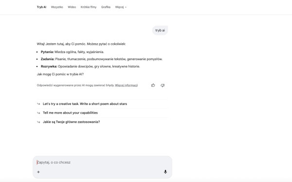 Tryb AI pozwala też prowadzić rozmowę. Jeśli coś wymaga doprecyzowania, możesz dopytać, a system wykorzysta wcześniejsze informacje, żeby płynnie kontynuować wątek. Taka interakcja skraca czas poszukiwań i ułatwia przechodzenie od ogólnych pytań do szczegółowych zagadnień.