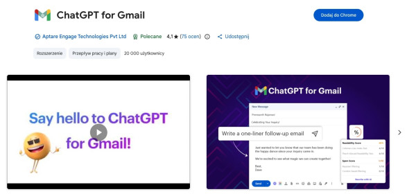 Wtyczka ChatGPT for Gmail dostępna w sklepie z rozszerzeniami dla Google Chrome