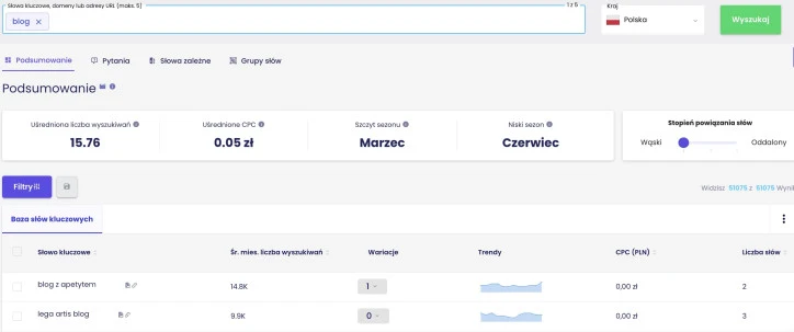 Wyszukiwanie słów kluczowych w panelu narzędzia Senuto