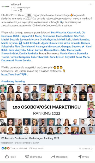 Chcesz zwiększyć zasięg swoich postów w mediach społecznościowych i dotrzeć do nowych odbiorców? Wykorzystaj oznaczenia innych osób i firm. W ten sposób być może zyskasz nowych obserwujących, a także zachęcisz oznaczone firmy lub osoby do udostępnienia materiału. Taktyka ta sprawdzi się zwłaszcza wówczas, gdy stworzysz angażujący materiał, np. zestawienie czy raport.