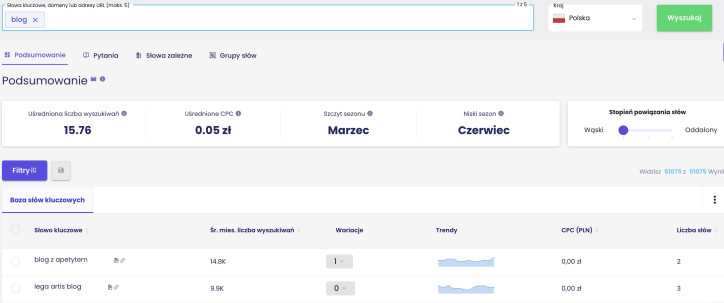 Wyszukiwanie słów kluczowych w panelu narzędzia Senuto