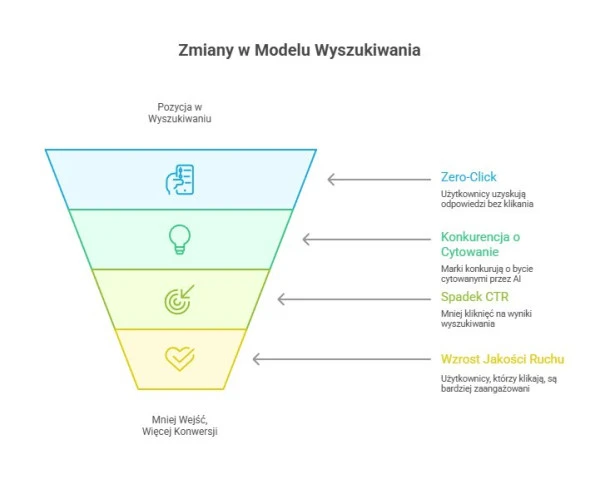Coraz większa część zapytań, zwłaszcza informacyjnych, jest obsługiwana przez odpowiedzi generowane przez AI bez konieczności przechodzenia na stronę, co zmienia sposób dystrybucji ruchu organicznego.