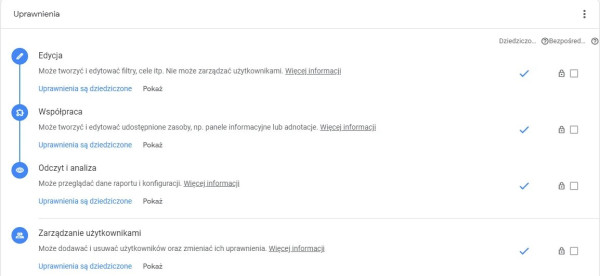 - Odczyt i analiza - to najniższy możliwy poziom dostępu, który pozwala jedynie na przeglądanie GA, bez jakiejkolwiek edycji