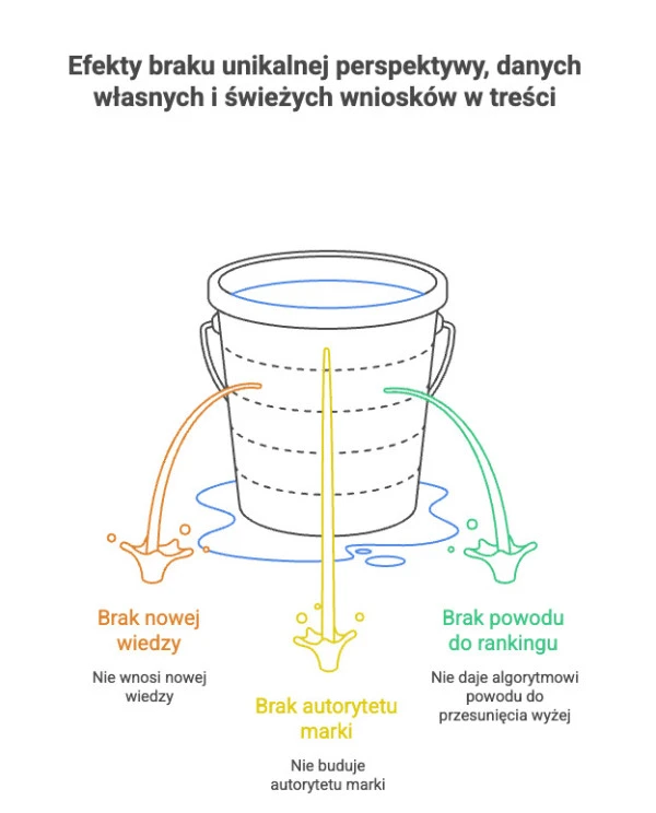 Jeśli artykuł jedynie kompiluje to, co już znajduje się w top 10, trudno mu przebić konkurencję. Brak unikalnej perspektywy, danych własnych czy świeżych wniosków sprawia, że treść: