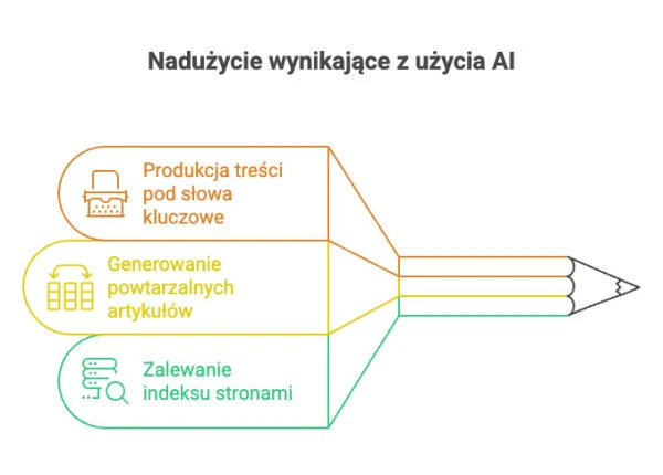 Problem zaczyna się gdzie indziej. W marcu 2024 roku, przy okazji aktualizacji algorytmu Google, Google wyraźnie podkreśliło walkę ze zjawiskiem określanym jako scaled content abuse. Chodzi o masowe, automatyczne tworzenie setek lub tysięcy stron bez realnej wartości. W tym kontekście AI może stać się narzędziem nadużycia, gdy służy do: