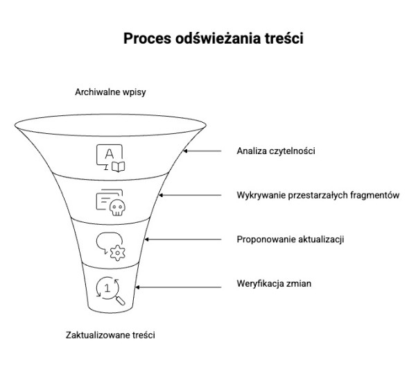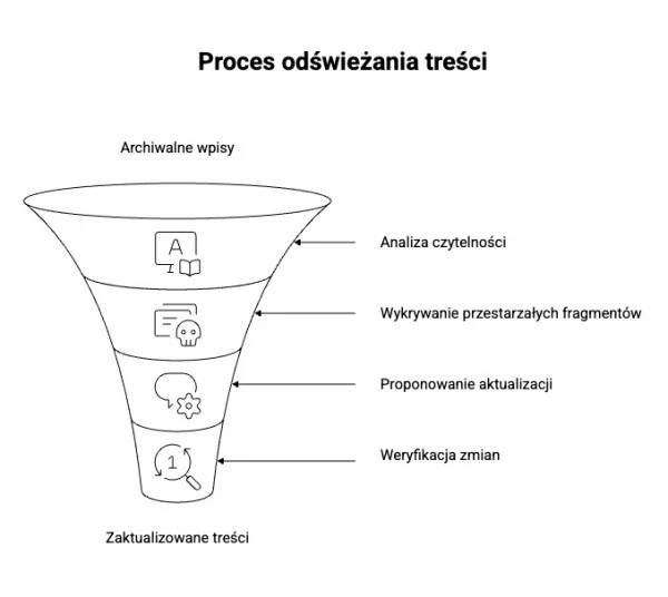 Archiwalne wpisy to często niewykorzystany potencjał. LLM mogą pomóc w analizie czytelności, wykryciu przestarzałych fragmentów i zaproponowaniu aktualizacji danych. Oczywiście każda zmiana powinna zostać zweryfikowana, jednak jako punkt wyjścia AI sprawdza się bardzo dobrze. Czy content wygenerowany przez AI szkodzi stronie? Nie, jeśli jest zaktualizowany.