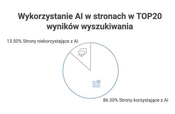 Dyskusja o AI w SEO długo opierała się na przeczuciach i pojedynczych case’ach. Tymczasem twarde dane pozwalają wyciągnąć jasne wnioski. Analiza około 600 000 stron, przeprowadzona m.in. przez Ahrefs, pokazuje, że wsparcie AI jest dziś powszechne. Szacuje się, że aż 86,5% stron w TOP20 wyników wyszukiwania korzysta w jakimś stopniu z narzędzi opartych na sztucznej inteligencji. Nie mówimy wyłącznie o pełnych artykułach generowanych automatycznie. Często chodzi o szkice, parafrazy, research czy dopracowanie struktury. Czy content wygenerowany przez AI szkodzi stronie? Badania pokazują, że nie.