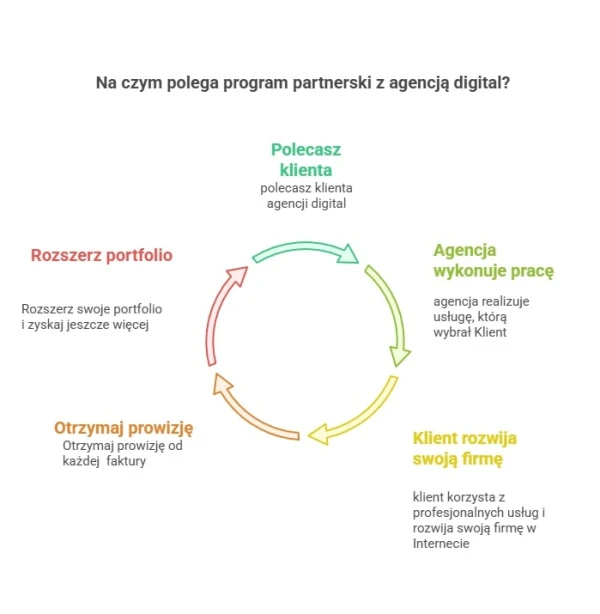 Nie ma tu ryzyka finansowego, nie tworzysz działu marketingu i nie zatrudniasz specjalistów. Całe zaplecze dostarcza agencja digital, a Twoja rola sprowadza się do polecenia usługi i utrzymania dobrej relacji z klientem. Dlatego partnerstwo jest traktowane przez wielu przedsiębiorców jako prosty sposób na rozwój firmy i poprawę stabilności finansowej.