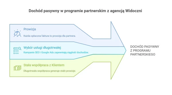 Współpraca partnerska z agencją digital to jeden z najprostszych i najskuteczniejszych sposobów na rozwój firmy bez ponoszenia dodatkowych kosztów. Pozwala poszerzyć ofertę o profesjonalne działania SEO, czy kampanie Google Ads, niezależnie od tego, czy masz własny dział marketingu, czy działasz jako freelancer, software house lub agencja kreatywna. Wchodząc w program partnerski możesz zaoferować klientom pełny zakres usług digital. Największą zaletą tego modelu jest możliwość generowania stałego, powtarzalnego dochodu pasywnego. Każda opłacona faktura klienta oznacza dla partnera dodatkowy przychód, a prowizja może wynosić nawet 25% od pierwszego klienta. A wszystko nie wymaga od Ciebie operacyjnej pracy nad kampaniami, ponieważ wszystkimi działaniami zajmuje się doświadczony zespół agencji Widoczni.