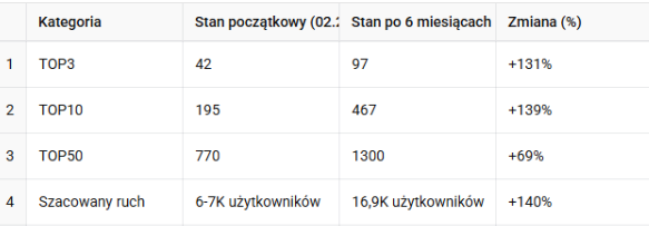 Tabela z efektami - case study SEO dla branży spożywczej