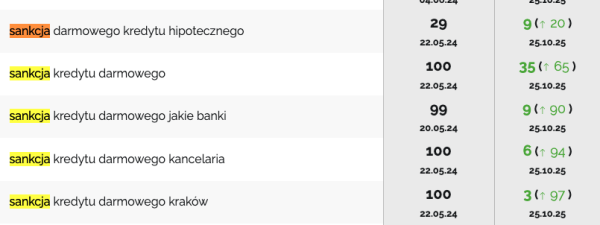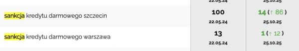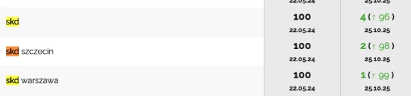 Klientowi szczególnie zależało na zwiększeniu widoczności i rozpoznawalności w obszarze SKD (sankcji kredytu darmowego). Od maja 2024 roku udało nam się znacznie zwiększyć widoczność aż na 10 kluczowych fraz. Frazy "skd warszawa" i "sankcja kredytu darmowego kraków", 'skd szczecin", "skd", startowały z pozycji 100, a obecnie są w TOP5 Google!