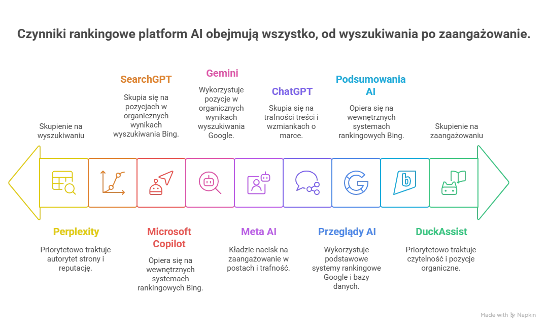 Skutkiem może być spadek ruchu na stronie mimo wysokich pozycji w Google. Warto więc już dziś podjąć kroki, aby zrozumieć, na czym polega SEO AI i jak możemy zapewnić sobie wysoką widoczność w odpowiedziach AI. Każdy model językowy bierze pod uwagę nieco inne czynniki. Zobacz, jak różni się to między poszczególnymi narzędziami AI: